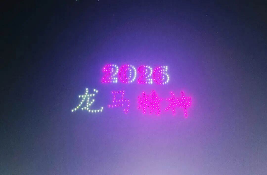 当晚,县体育场附近人头攒动,上万名市民扶老携幼欢聚,等候展演启幕。随着新春旋律响起,无人机编队率先升空,300架无人机默契联动,时而组成“2026马上成功”“2026龙马精神”及企业拜年字样,传递发展期许与政企温情;时而化作倒酒入杯、金凤腾飞、蝴蝶翩飞等图案,将团圆祝福与地域韵味融入光影,每一次变换都引来阵阵欢呼。