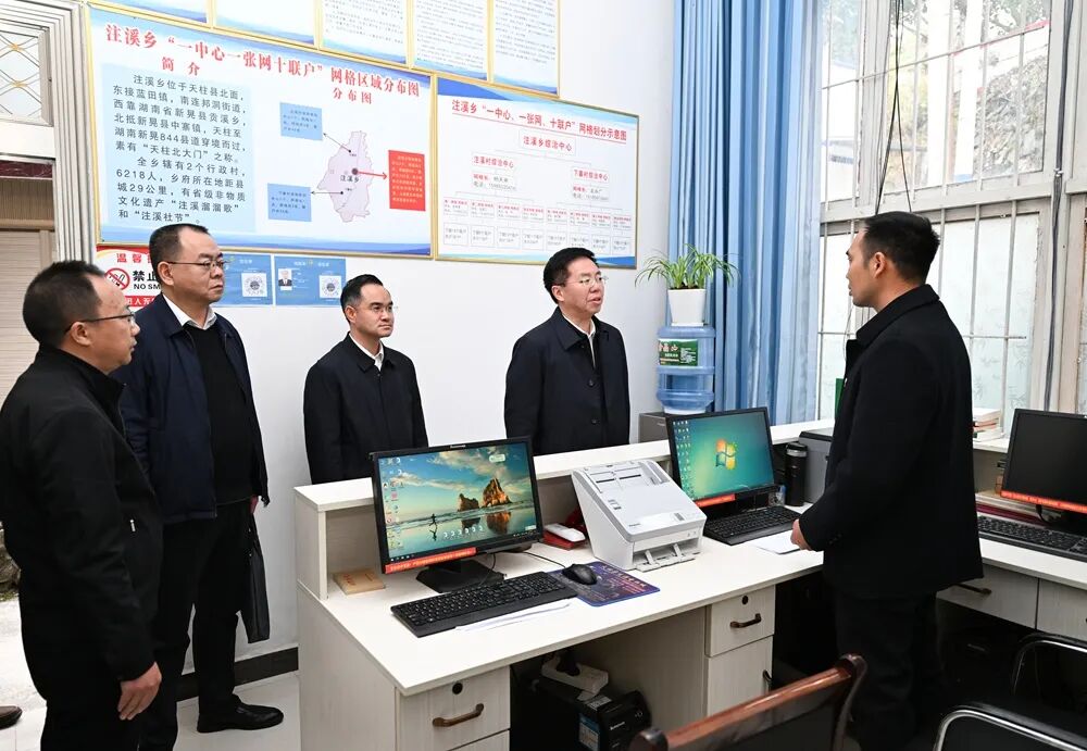 图为李建在天柱县社会治安综合治理中心调研。