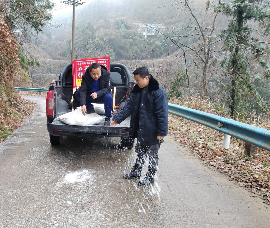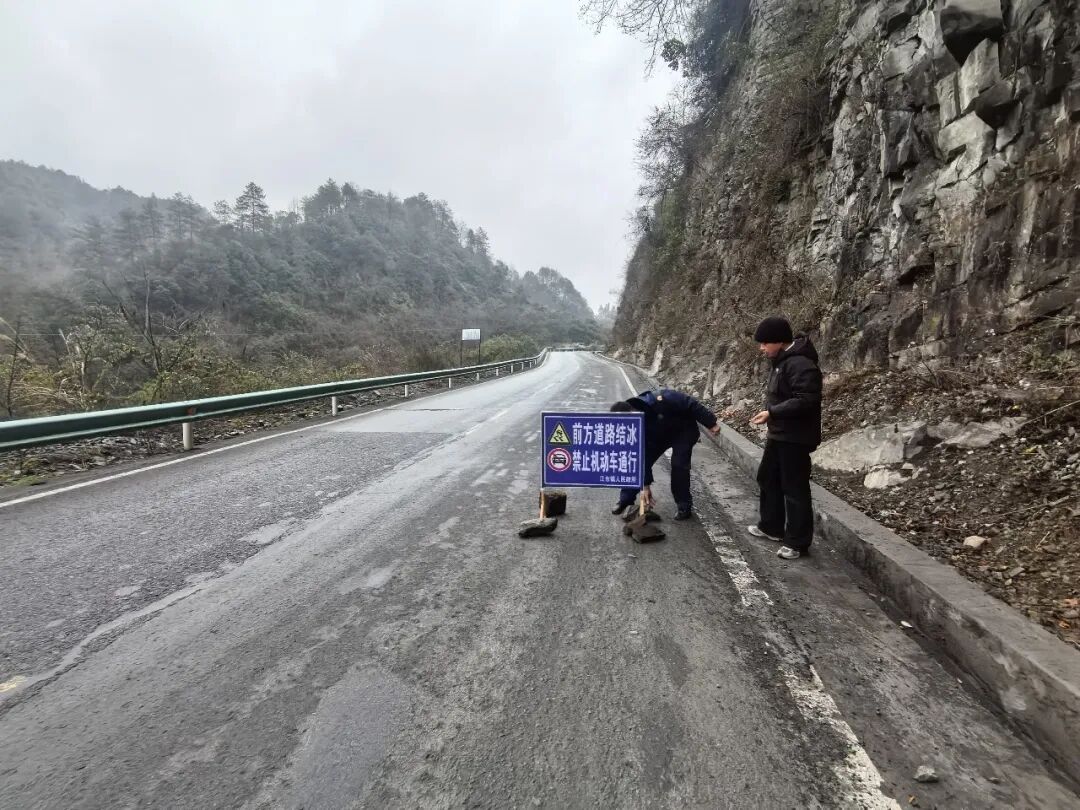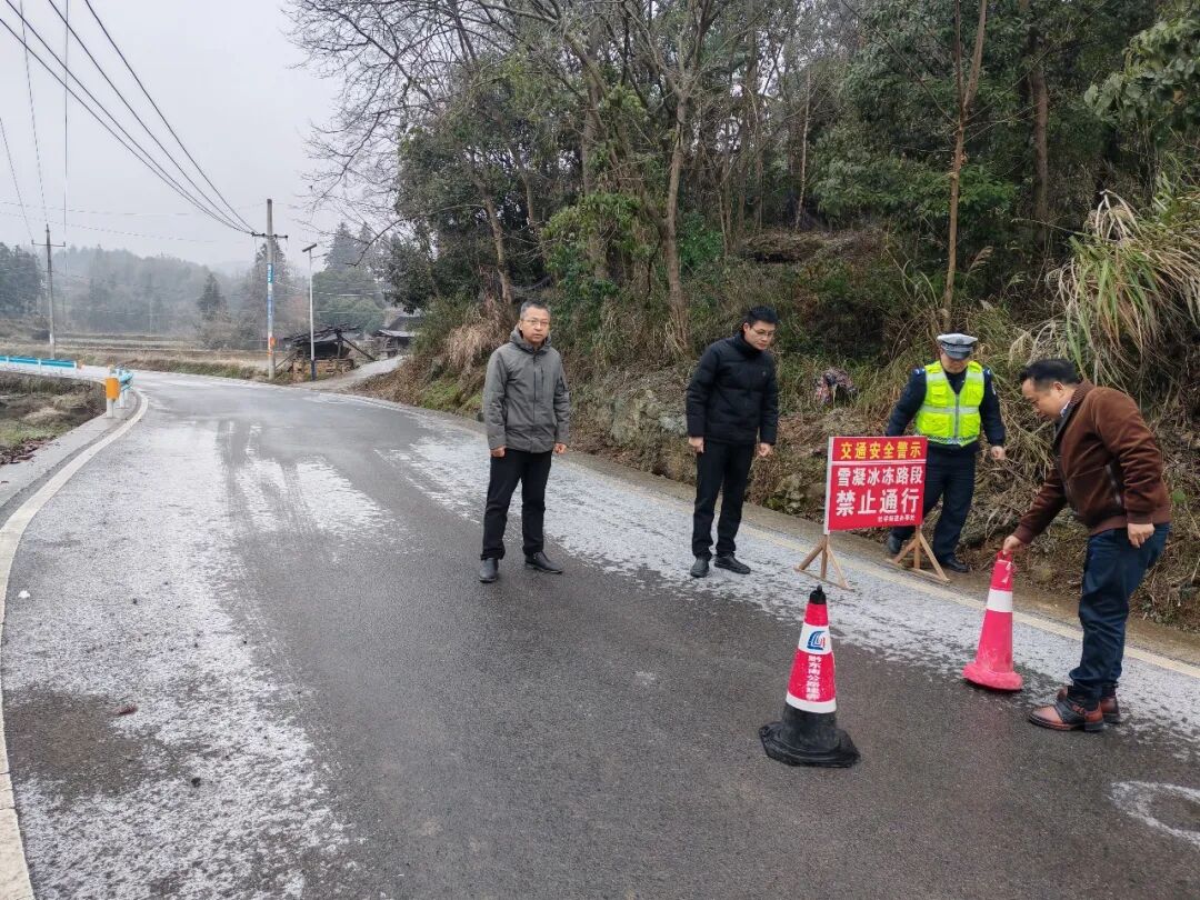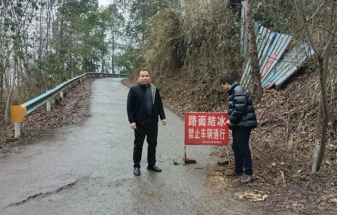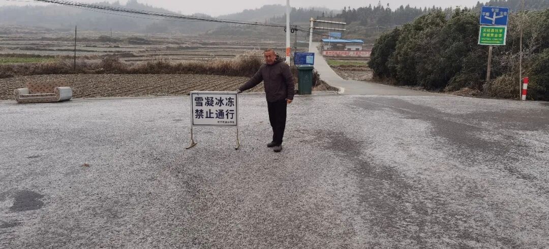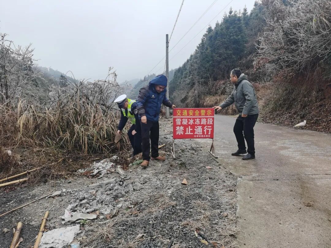 受持续强降温天气影响,社学街道金凤村、溪口村、金溪村等部分高海拔地段出现道路结冰现象,给群众出行带来较大安全隐患。社学街道迅速启动应急预案,第一时间组织街道干部、派出所民警、村“两委”组成应急处置队伍,奔赴各重点路段开展安全管控工作。在结冰路段,工作人员通过设置“雪凝冰冻禁止通行”警示牌、摆放交通锥等方式实施临时封控,对过往车辆进行劝返;夜间则安排专人值守巡查,严防车辆违规通行引发安全事故,全力保障辖区群众生命财产安全。
