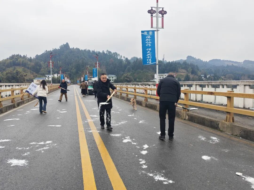 坌处镇部分路面结冰给群众出行带来极大安全隐患。镇党委、镇政府迅速启动应急响应,领导班子、镇村干部、驻村工作队等迅速集结,手持铁锹、扫帚等工具,在村寨主干道、陡坡弯道、桥梁等重点区域开展除冰工作,全力保障道路畅通和群众出行安全。
