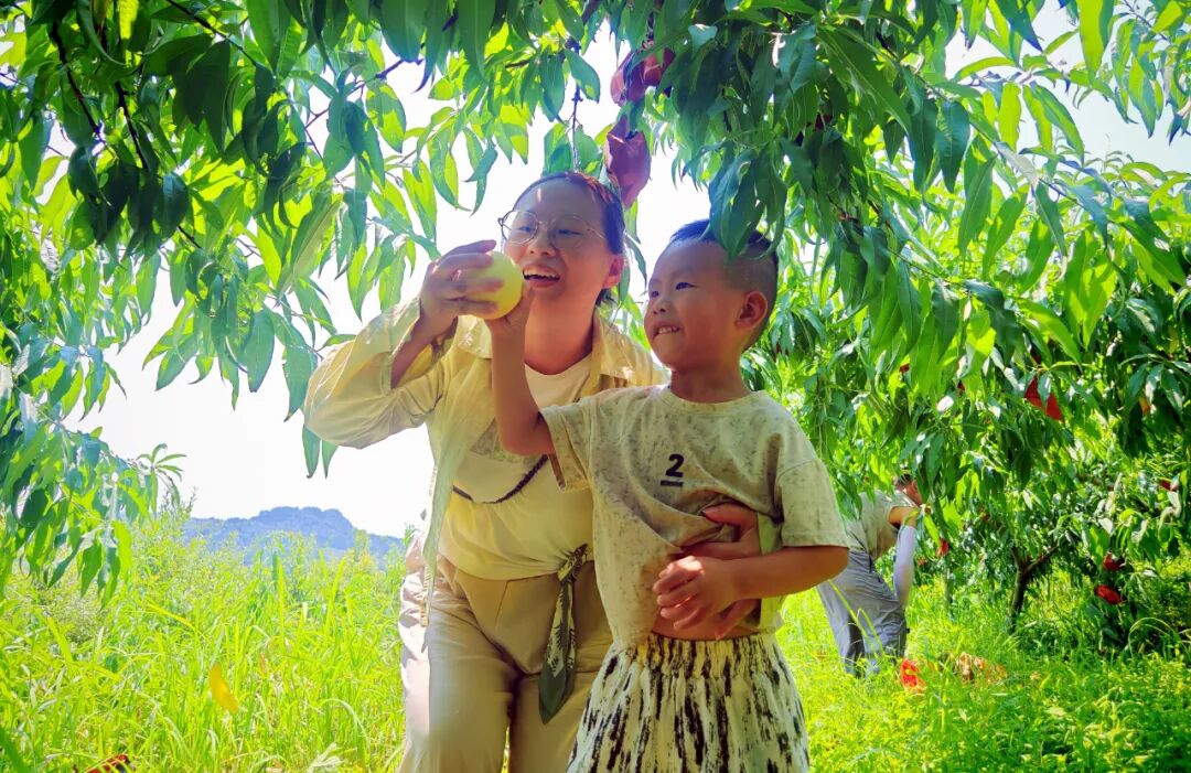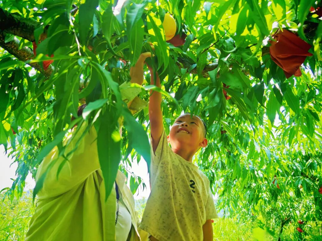 “今天爸爸妈妈带我来摘水蜜桃,我摘了十多个,桃子很大、很甜。”杨武坤小朋友踮着脚尖,小心翼翼地掰下一个桃子,兴奋地向镜头展示。饱满圆润的果实表皮绒毛细密,咬上一口,金黄果肉汁水四溢,清甜脆爽的滋味瞬间在舌尖化开。