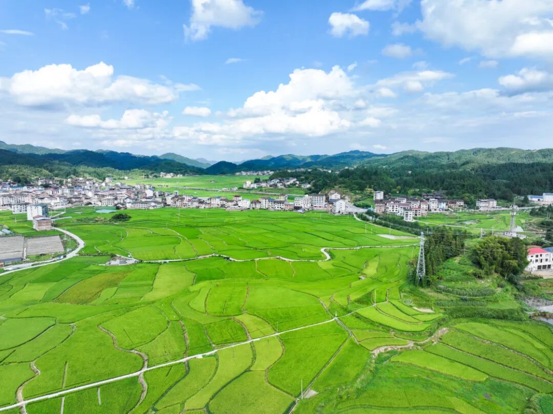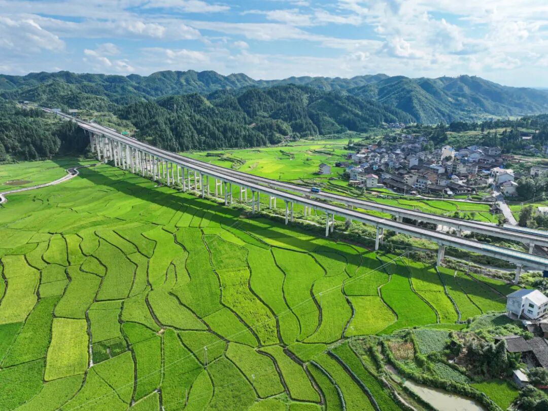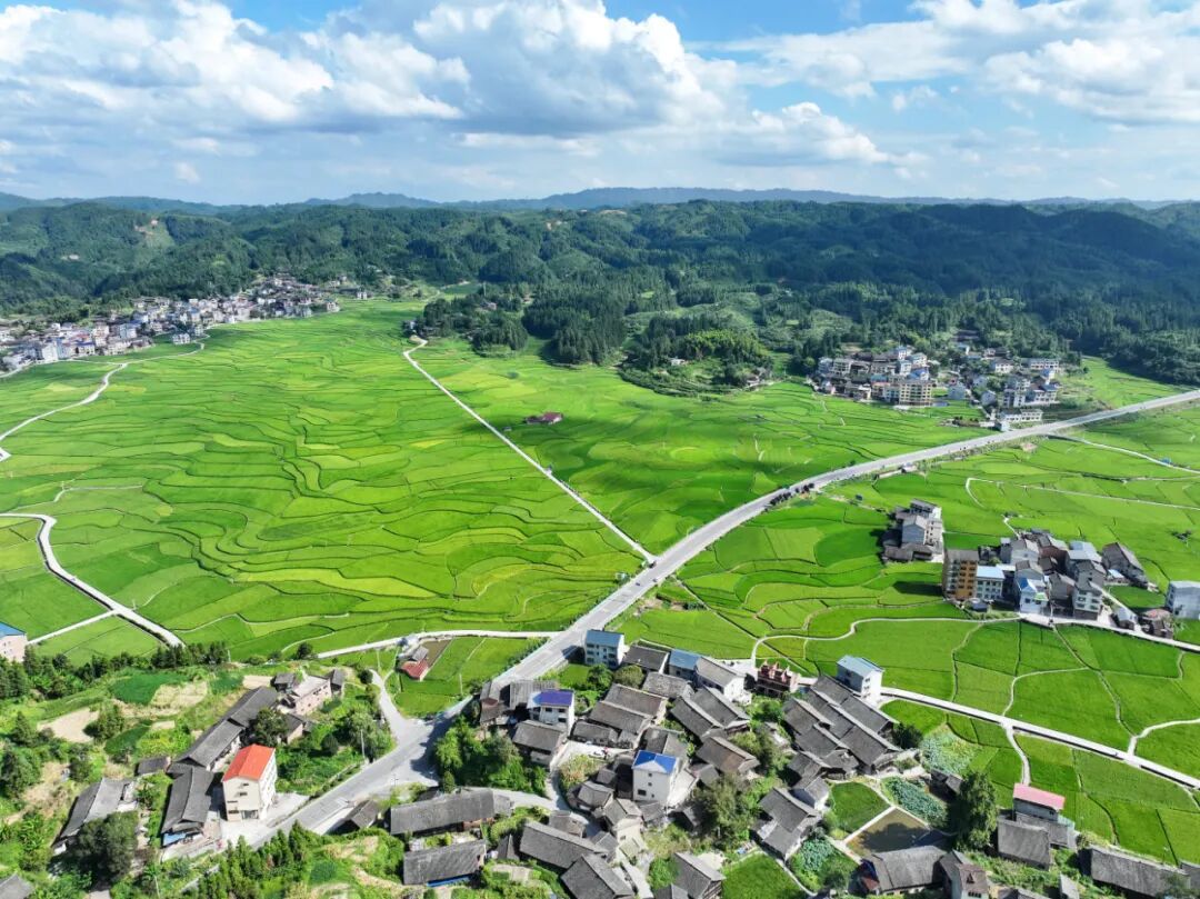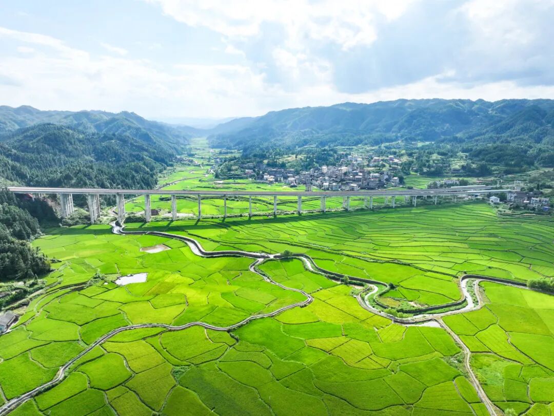 初秋时节,天柱县高酿大坝绿意盎然,阡陌纵横的稻田与桥梁、村庄、青山相映成趣,构成一幅美丽的乡村田园画卷。