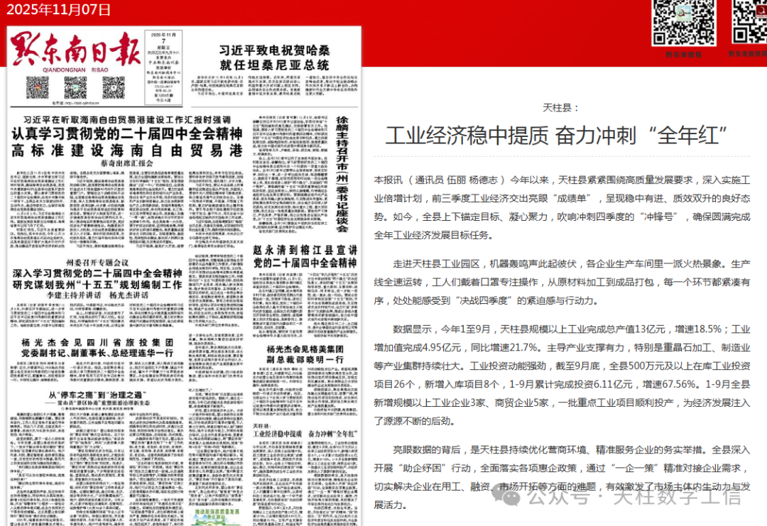 今年以来,天柱县紧紧围绕高质量发展要求,深入实施工业倍增计划,前三季度工业经济交出亮眼“成绩单”,呈现稳中有进、质效双升的良好态势。如今,全县上下锚定目标、凝心聚力,吹响冲刺四季度的“冲锋号”,确保圆满完成全年工业经济发展目标任务。